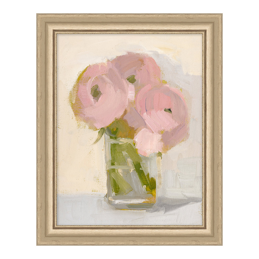 This captivating artwork features three delicate pink flowers arranged in a glass vase, rendered with exquisite detail through giclee printing on canvas. Mounted on hardboard and artist-enhanced, the piece offers a textured, vibrant finish. Framed without glass, it invites a closer connection to the art’s subtle colors and intricate brushwork, making it a striking addition to any space.