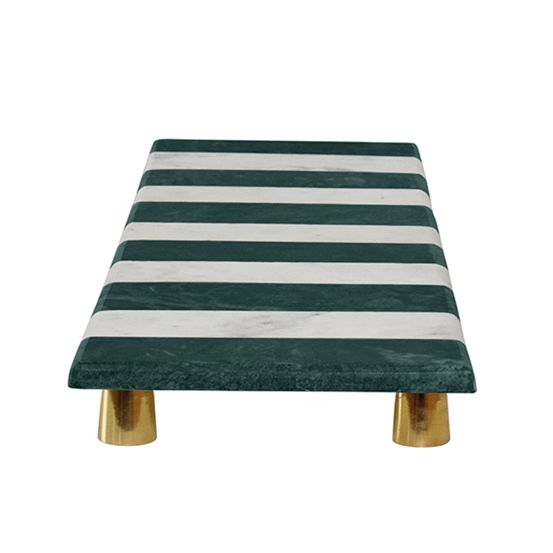 The Becky tray brings natural elegance to your surfaces with its striking green and white marble composition. Supported by refined brass feet, this piece combines functionality with artistic flair. Each tray's unique veining ensures a unique accent piece.